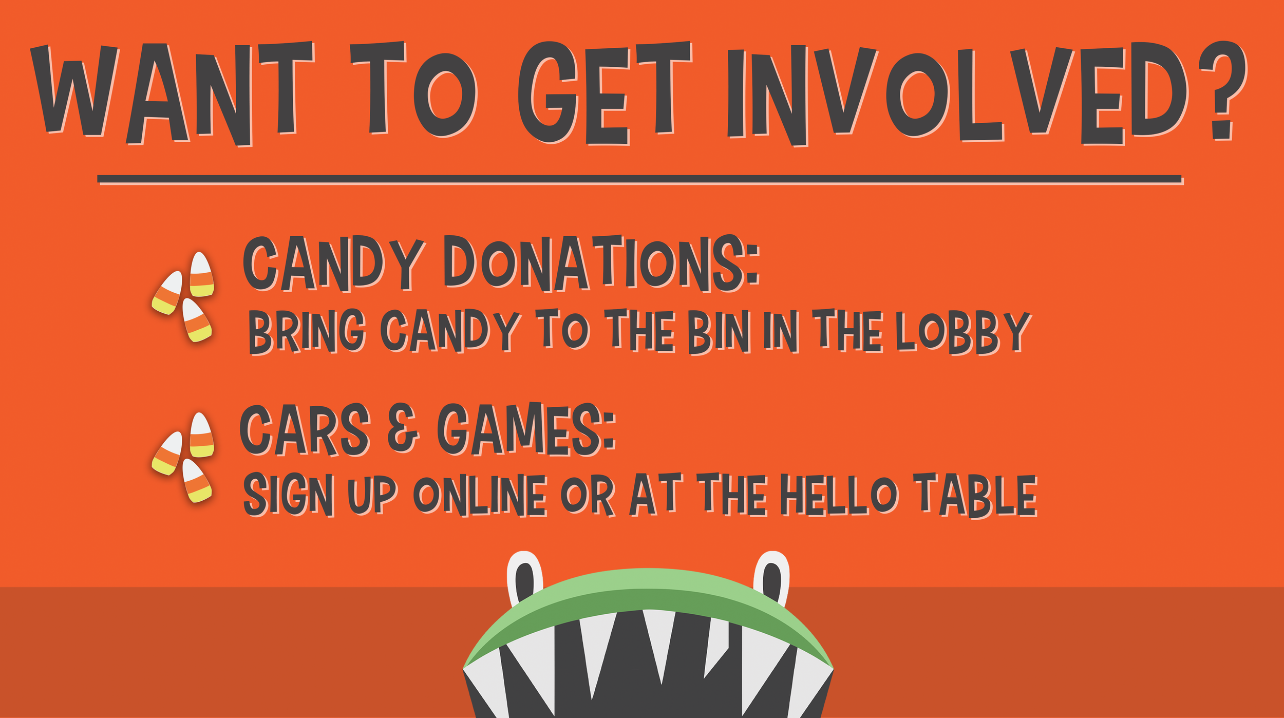 In the month of October, we are collecting donations for candy and seeking signs up for cars to be decorated!